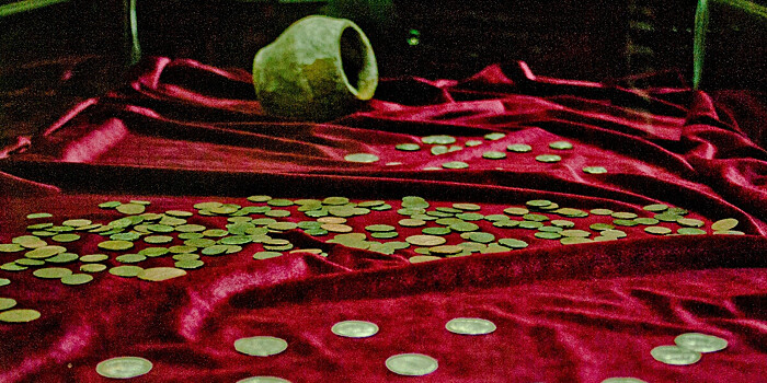 Специалисты раскопали участок глубиной 60 см и шириной около метра и увидели 1060 связок монет по 100 штук в каждой. Монеты были перевязаны соломенной веревкой.