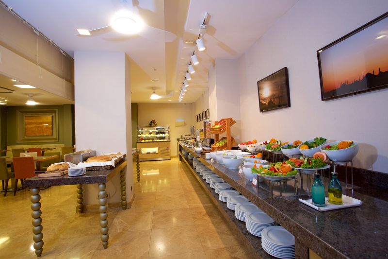 Менемен — популярное блюдо турецкой кухни, представляющее собой яичницу-болтунью с помидорами, зелёным перцем, луком и специями. Также подают йогурты, мюсли, сезонные фрукты, десерты и ароматную выпечку. Особенно хороши здесь сливочные пудинги, за которые отдельное спасибо шеф-повару ресторана отеля.